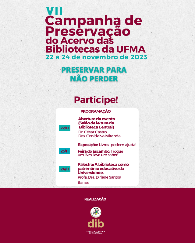 A Diretoria Integrada de Bibliotecas realizará a VII Campanha de Preservação do Acervo das Bibliotecas da DIB no período de 22 a 24 de novembro de 2023. Com o tema “Preservar para não perder”, a campanha tem como objetivo conscientizar a comunidade acadêmica quanto ao uso adequado dos livros.
